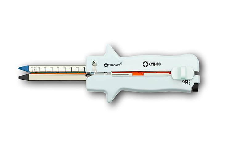 一次性使用直線型切割吻合器及切割組件提供左右各兩排交錯的鈦釘,可同時閉合并切割兩組鈦釘之間的組織。