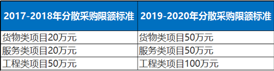 (三)縣級分散采購限額標準:貨物、工程和服務類項目,單項或者批量采購預算金額從10萬上調(diào)至20萬元。