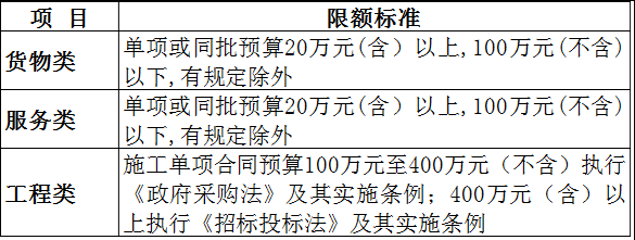 采購貨物、服務和工程類項目限額標準為:貨物、服務類項目單項或批量采購預算金額達到20萬元(含20萬元);工程類項目采購預算金額達到50萬元(含50萬元)。